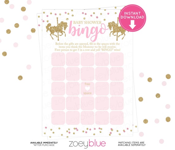 Carousel Baby Shower Bingo Card Pink Gold Merry Go Round Blank