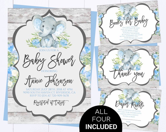 Blue Elephant Baby Shower Boy Invite Blue Floral Baby Shower Etsy